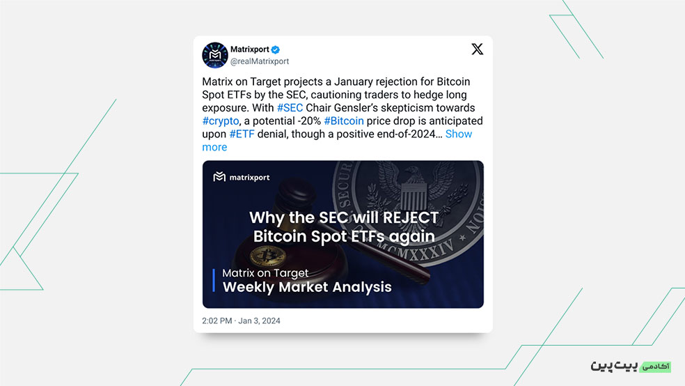 باور عدهای بر این است که ETF تنها زمانی تایید میشود که مردم انتظارش را نداشته باشند. نوسانات اخیر قیمت که با اخبار ETF رخ داد، دیدگاه خوبی برای قانونگذاران ایجاد نمیکند. این باعث میشود که این نهادها دوباره بگویند که این دارایی نوسانی برای سرمایهگذاران مناسب نیست – که میتواند منجر به تاخیر یا حتی عدم تایید شود. علاوه بر این، از تحقیقات مرتبط با بایننس و حضور مدیرعامل سابق آن در دادگاه در ژانویه نیز غافل نشوید.