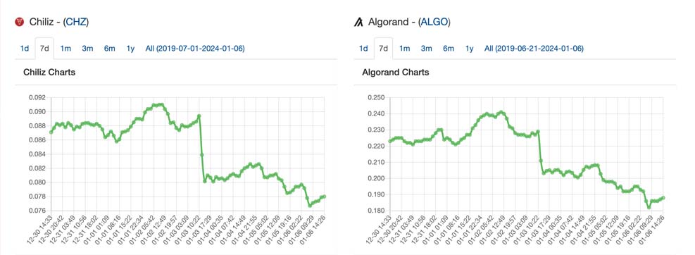 همچنین با نگاهی به نمودار قیمتی CHZ و ALGO در هفته اخیر، میبینیم این دو رمزارز عملکرد قیمتی شبیه به هم دارند.