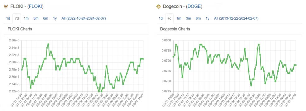 در تصویر زیر به مقایسه تغییرات قیمتی رمزارزهای FLOKI و DOGE در بازههای زمانی مختلف پرداختیم.
