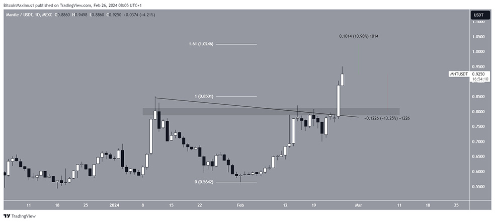 قیمت MNT از ابتدای ژانویه به سرعت افزایش یافته است. در ابتدا با مقاومت داینامیک (افقی) خود مواجه شد اما در 25 فوریه از آن عبور کرد. شکست این مقاومت منجر به رسیدن به قیمت 0.95 دلار شد که سطحی جذاب برای سرمایهگذاران این رمزارز است. اگر حرکت صعودی MNT ادامه یابد، قیمت میتواند با 11 درصد افزایش به 1.03 دلار برسد.