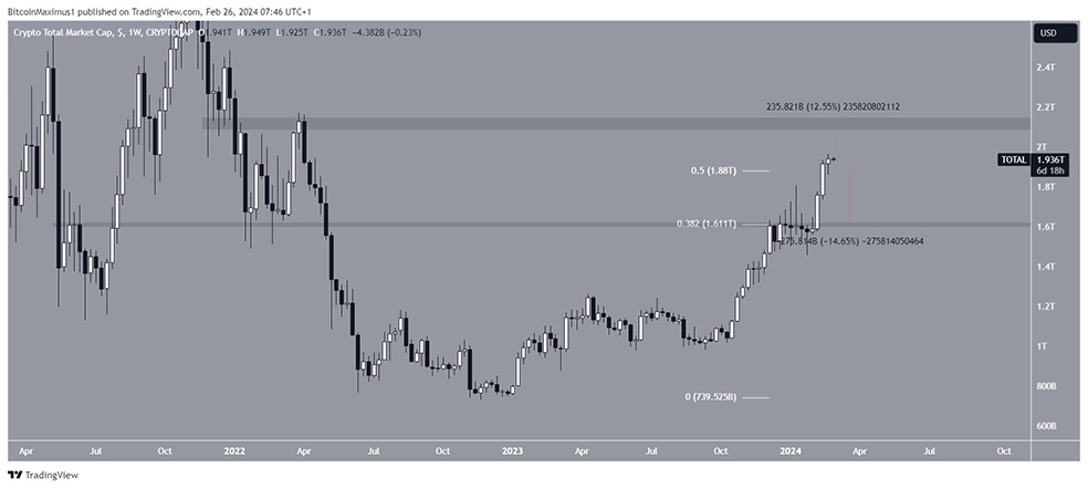 شاخص ارزش کل بازار (TOTALCAP) پس از حرکت به بالای سطح مقاومت فیبوناچی اصلاحی 0.382 در 1.61 تریلیون دلار، افزایش یافت و بالاتر از سطح مقاومت فیبوی 0.5، یعنی 1.88 تریلیون دلار بسته شد. اگر حرکت صعودی ادامه یابد، مقاومت بعدی 2.10 تریلیون دلار خواهد بود که 9 درصد بالاتر از قیمت فعلی است.
