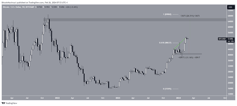 پس از پنج کندل صعودی متوالی، قیمت بیت کوین اولین کندل نزولی خود را در هفته گذشته ایجاد کرد. اگر این ارز دیجیتال در زیر سطح مقاومت فیبوی اصلاحی ۰.۶۱۸ کندلی نبندد، میتواند تا مقاومت بعدی در ۶۵,۰۰۰ دلار رشد داشته باشد: یعنی ۲۵ درصد بالاتر از قیمت فعلی.